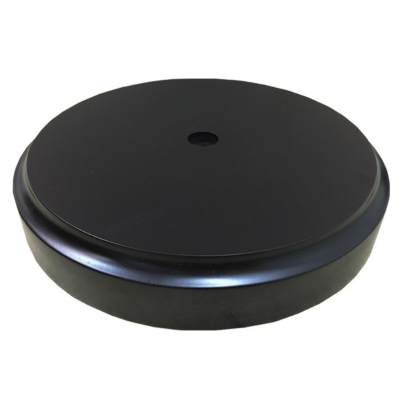 Socle en bois vernis foncé pour hampe en deux parties. Haut de 9 centimètres, le socle a un diamètre de 35 centimètres.