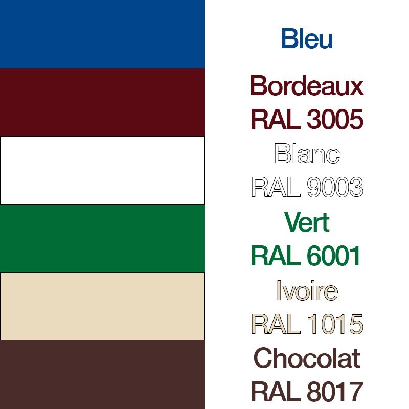 | Couleurs standard du fond (voir sur les photos du produit) | Bleu Bordeaux RAL 3005 Blanc RAL 9003 Vert RAL 6001 Ivoire RAL 1015 Chocolat RAL 8017 | Bleu |